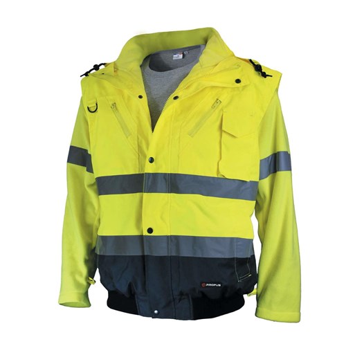 Jest to idealna kurtka do pracy w niepogodę i w chłodniejsze miesiące dla osób pracujących w warunkach, gdzie wymagana jest dobra widoczność pracownika zarówno w dzień (podczas niekorzystnych warunków atmosferycznych), jak i w nocy. Może być ona oczywiście używana, jako zwykła ochronna kurtka, zwłaszcza, że została wykonana z wodoodpornego materiału, jest ocieplana i posiada odblaskowe kolory. Ponadto została wyposażona w wiele kieszeni, co jest niezwykle praktyczne przy przechowywaniu podręcznych narzędzi. W okresie wiosennym kurtka może służyć jako kamizelka, ponieważ istnieje możliwość odpięcia rękawów, kaptura i wewnętrzengo polaru, który również może być uzywany samodzielnie.