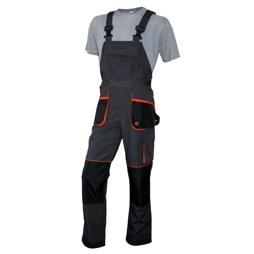 Grafitowo-czarne spodnie z pomarańczowymi wstawkami zostały wykonane z bawełny i poliestru. Posiadają wielofunkcyjne kieszenie, które – z racji że są podatne na przetarcia i oberwania – zostały wzmocnione dodatkową warstwą poliestru. Elastyczne gumy w szelkach oraz regulacja w pasie zapewnią idealne dopasowanie do ciała użytkownika. Spodnie posiadają również dodatkowe kieszenie na nakolanniki, które po zamontowaniu nakolanników zapewniają większy komfort przy pracach na kolanach. W porównaniu do kolekcji KOLMAR, w KOLMAR NEW zmieniono sposób zapinania obu przednich kieszeni. Obie zapinane są na płaskie zamki w kolorze pomarańczowym. Zmienione zostały również kieszenie na klatce piersiowej. W aktualnej wersji są praktyczniejsze i wygodniejsze w użytkowaniu.