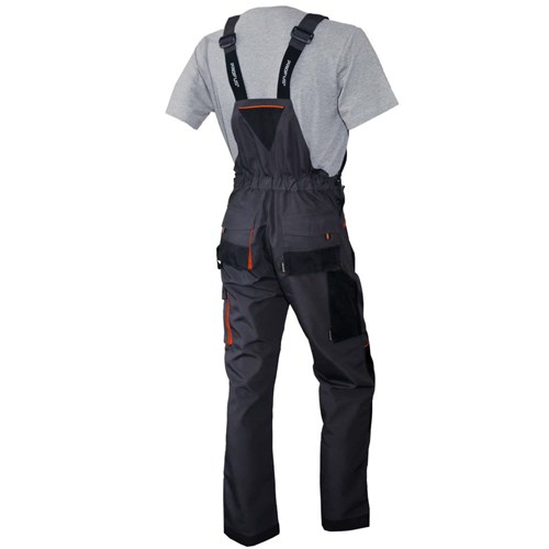 Grafitowo-czarne spodnie z pomarańczowymi wstawkami zostały wykonane z bawełny i poliestru. Posiadają wielofunkcyjne kieszenie, które – z racji że są podatne na przetarcia i oberwania – zostały wzmocnione dodatkową warstwą poliestru. Elastyczne gumy w szelkach oraz regulacja w pasie zapewnią idealne dopasowanie do ciała użytkownika. Spodnie posiadają również dodatkowe kieszenie na nakolanniki, które po zamontowaniu nakolanników zapewniają większy komfort przy pracach na kolanach. W porównaniu do kolekcji KOLMAR, w KOLMAR NEW zmieniono sposób zapinania obu przednich kieszeni. Obie zapinane są na płaskie zamki w kolorze pomarańczowym. Zmienione zostały również kieszenie na klatce piersiowej. W aktualnej wersji są praktyczniejsze i wygodniejsze w użytkowaniu.