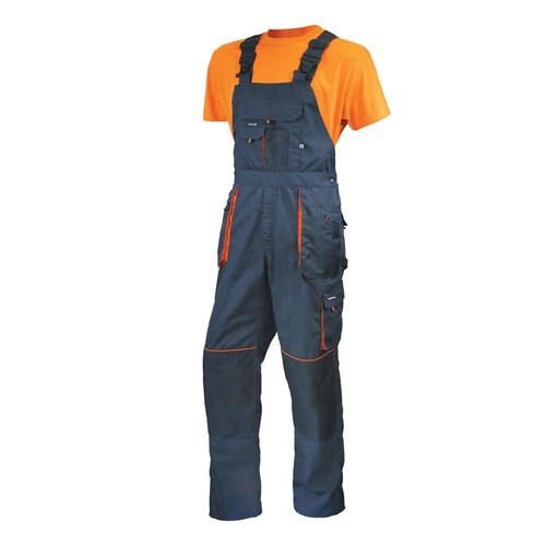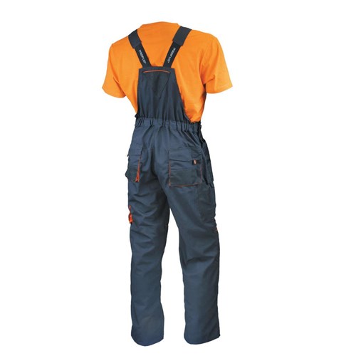 Grafitowo-czarne spodnie z pomarańczowymi wstawkami zostały wykonane z bawełny i poliestru. Posiadają wielofunkcyjne kieszenie, które – z racji że są podatne na przetarcia i oberwania – zostały wzmocnione dodatkową warstwą poliestru. Elastyczne gumy w szelkach oraz regulacja w pasie zapewnią idealne dopasowanie do ciała użytkownika. Spodnie posiadają również dodatkowe kieszenie na nakolanniki, które po zamontowaniu nakolanników zapewniają większy komfort przy pracach na kolanach.