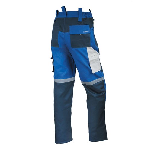 Granatowo-niebieskie spodnie z odblaskowymi wstawkami zostały wykonane w całości z bawełny. Posiadają duże, wielofunkcyjne kieszenie oraz uchwyty do zawieszenia narzędzi lub zewnętrznych sakw. Spodnie posiadają również dodatkowe miejsce na nakolanniki, które po zamontowaniu nakolanników zapewniają większy komfort przy pracach na kolanach.