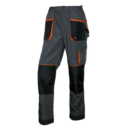 Grafitowo-czarne spodnie z pomarańczowymi wstawkami zostały wykonane z bawełny i poliestru. Posiadają wielofunkcyjne kieszenie, które – z racji że są podatne na przetarcia i oberwania – zostały wzmocnione dodatkową warstwą poliestru. Spodnie posiadają również dodatkowe kieszenie na nakolanniki, które po zamontowaniu nakolanników zapewniają większy komfort przy pracach na kolanach. W porównaniu do kolekcji KOLMAR, w KOLMAR NEW zmieniono sposób zapinania obu kieszeni przednich. Z prawej kieszeni usunięto również kieszonkę na komórkę.
