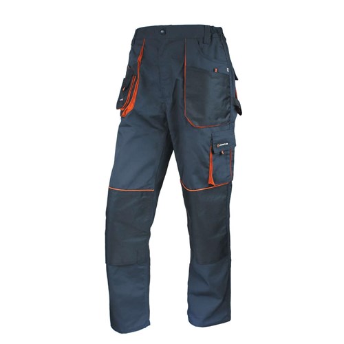 Grafitowo-czarne spodnie z pomarańczowymi wstawkami zostały wykonane z bawełny i poliestru. Posiadają wielofunkcyjne kieszenie, które – z racji że są podatne na przetarcia i oberwania – zostały wzmocnione dodatkową warstwą poliestru. Spodnie posiadają również dodatkowe kieszenie na nakolanniki, które po zamontowaniu nakolanników zapewniają większy komfort przy pracach na kolanach.