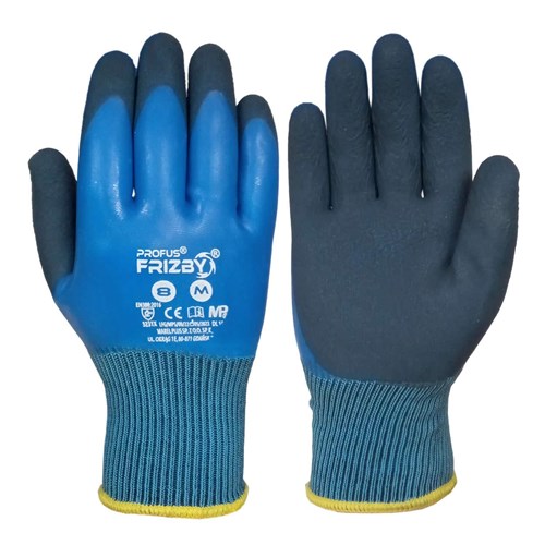 Rękawice ochronne FRIZBY wykonane zostały z akrylowej dzianiny bezszwowej. Za sprawą elastycznego ściągacza (który idealnie dopasowuje rękawice do kształtu dłoni) nawet wielogodzinna praca jest niezwykle komfortowa. Rękawica w całości została powleczona lateksem, a dla pewnego chwytu dłoń powleczono drugą warstwą szorstkowanego lateksu. Dodatkowo zastosowana została technologia Sanitized, która odpowiada za odczucie świeżości oraz ochronę przed bakteriami.